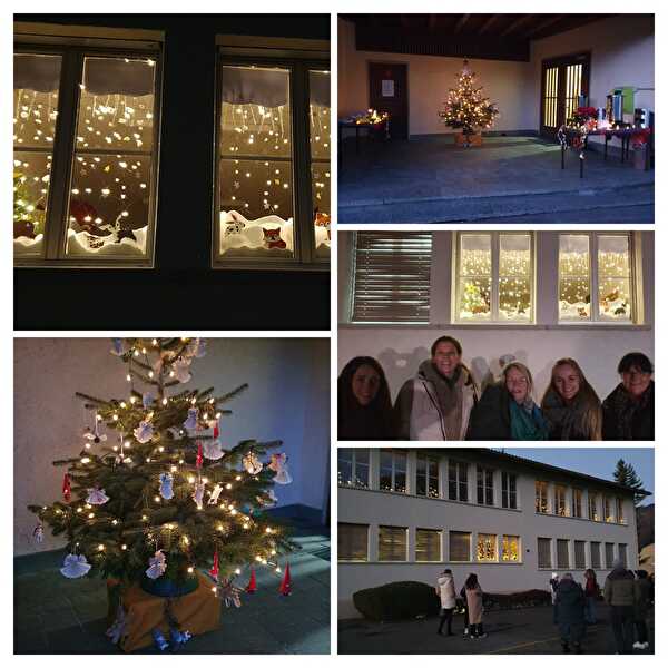 Am 18. November führten die 4. und 6. Klässler von Rufi einen Bastelnachmittag für das Adventsfenster durch. Sie fingen an, aus alten Buchseiten Engel, aus WC-Papier-Rollen Girlanden, mit Gold- und Silber-Papier Girlanden sowie aus gelbem und weissem Papier Sterne zu gestalten. Die schöne Deko hängten sie dann am Tannenbaum, an den Fenstern oder im Treppenhaus des Schulhauses auf. Der Tannenbaum stand im Eingang und präsentierte die hübschen Wichtel und Engel schon bevor man das Schulhaus überhaupt betrat.